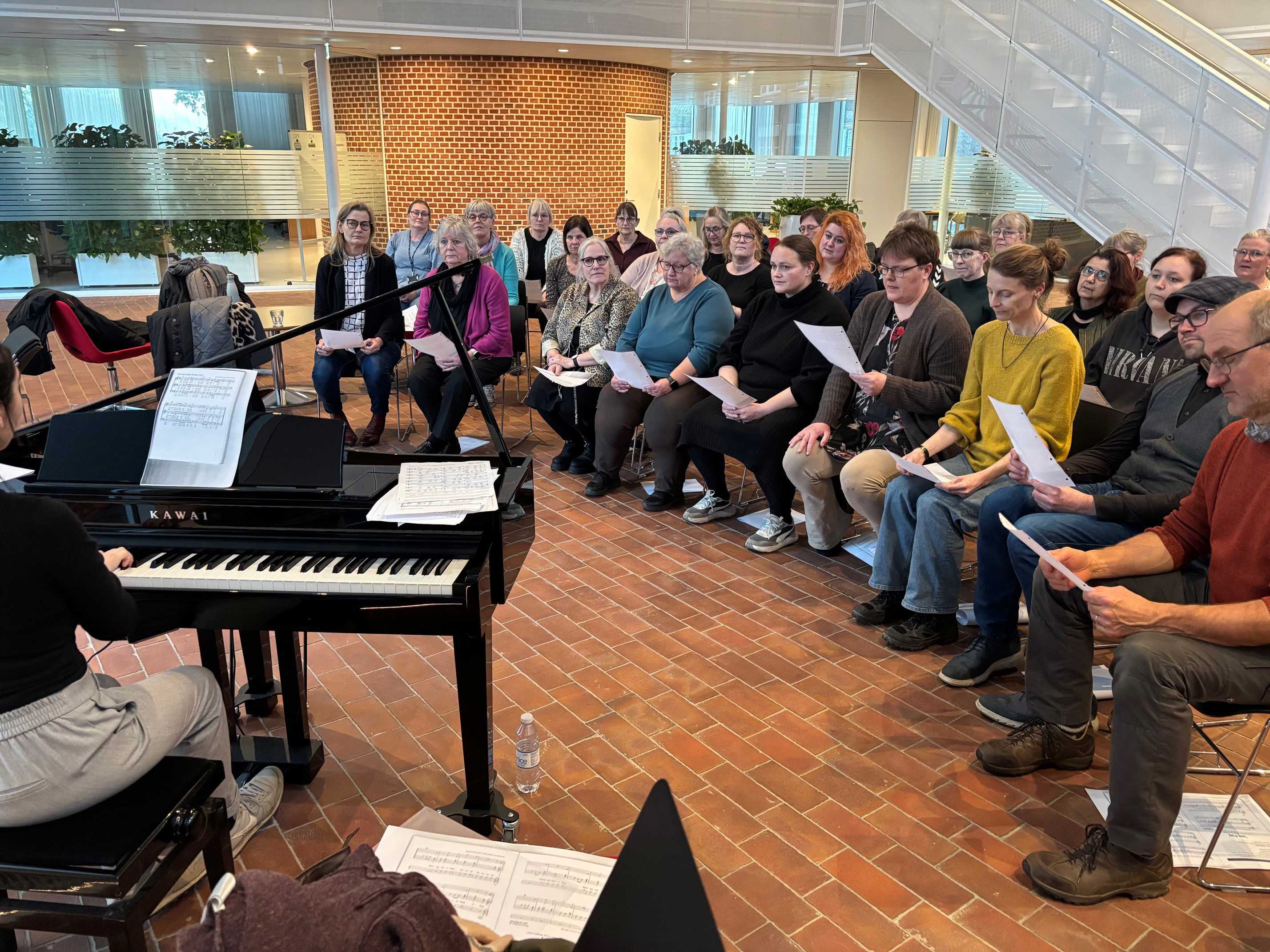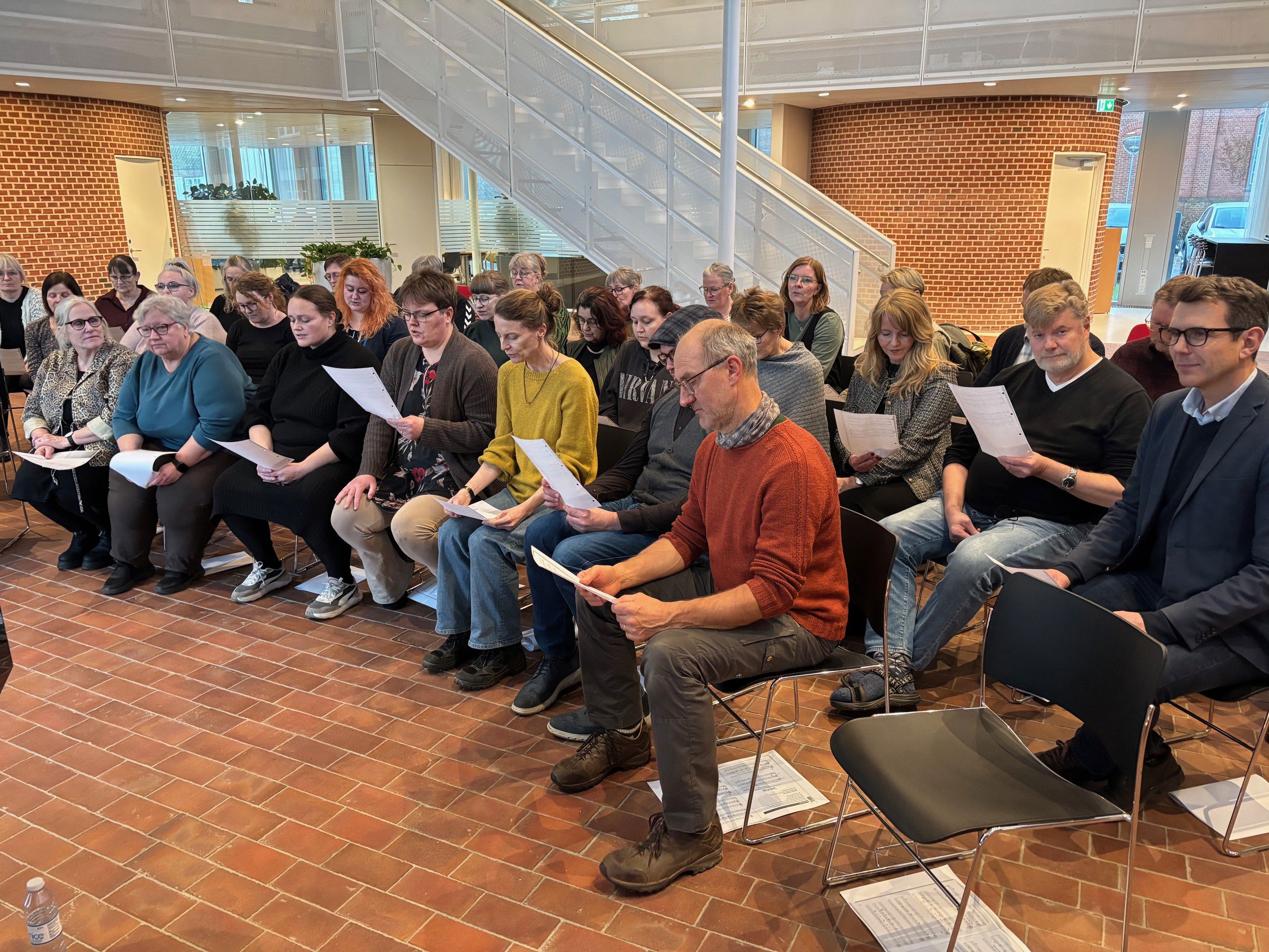 Medarbejdere fra rådhuset i Tønder synger i kor sammen.